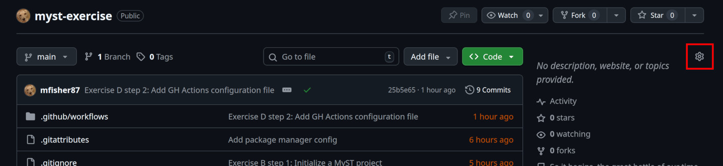Visit the URL for your GitHub repo homepage. Towards the top-right, click the cog/gear icon (⚙️).