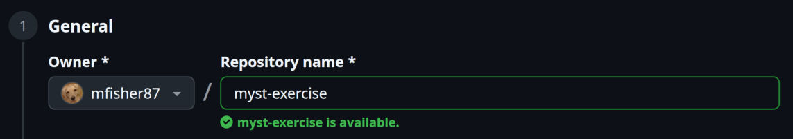 Select your username as the owner, and enter myst-exercise as the repository name.